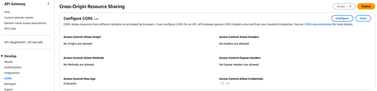 - Wechseln Sie zu CORS und klicken Sie auf Configure