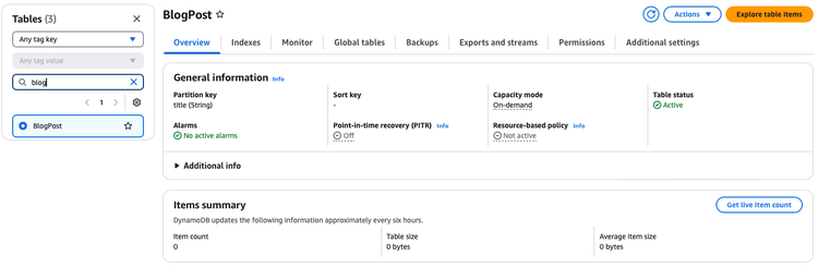 1. Im DynamoDB Dashboard, klicken Sie auf Tables und selektieren Sie Ihre neu erstellte Tabelle.