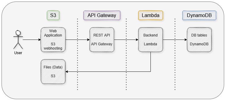 Web Application: Der Benutzer interagiert mit der Webanwendung. Der Build der Webanwendung wird in einem S3-Bucket gespeichert und über das statische Webhosting öffentlich zugänglich gemacht. Anfragen werden an die REST-API gesendet.
