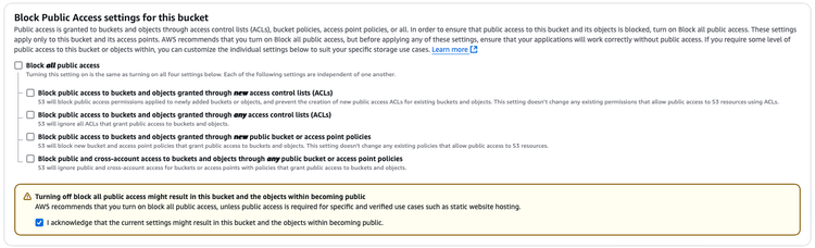 - Deselektieren Sie Block all public access wenn die Webseite öffentlich erreichbar sein soll und bestätigen Sie diese Aktion.